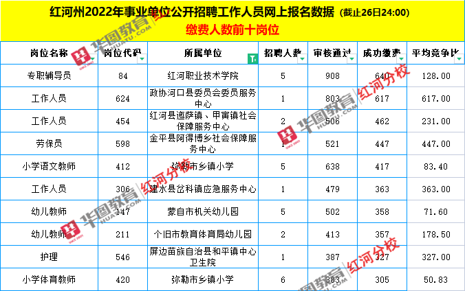 红河州最终缴费数据新鲜出炉,审核通过人数38840人,成功缴费30779人,平均竞争比36.95:1,县份平均竞争比最高是元阳,达62:1,岗位竞争比最高是政协河口县委员会委员服务中心-工作人员岗,达617:1!